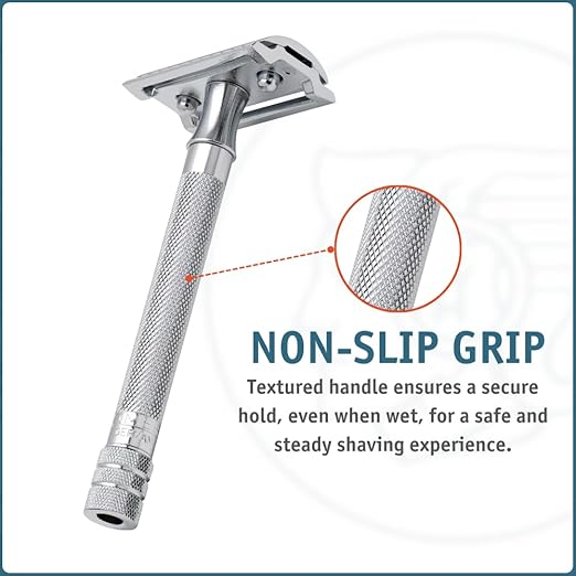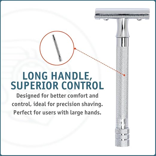 Le long manche permet un rasage en douceur et le peigne fermé est un outil polyvalent pour le rasage humide classique. L'espace généreux de la lame permet un débit de savon élevé protégeant la tête du rasoir contre le colmatage avec des cheveux coupés ou des résidus de mousse.