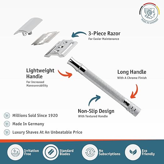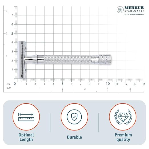 Rasoir de sécurité Merkur 23C à long manche et double tranchant, finition chromée