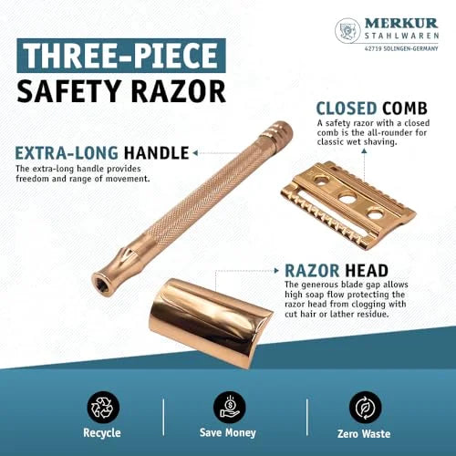 Manche long : Conçu pour un contrôle et une maniabilité sans effort, le rasoir Merkur DE est doté d'un long manche qui offre une prise confortable. Que vous ayez de grandes mains ou que vous préfériez une portée plus longue, la poignée allongée offre une stabilité et une précision améliorées pendant le rasage.