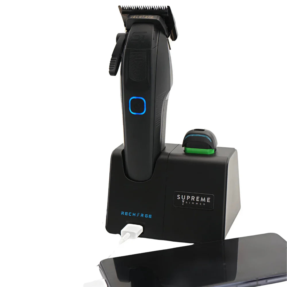 The Recharge Clipper by Supreme Trimmer is built for nonstop performance and unmatched versatility. Designed with a removable external battery and three smart charging options, it keeps you powered and productive whether in the barbershop or on the go. Featuring a brushless motor, DLC taper blade, and click lever control, this clipper delivers smooth, precise cuts with maximum convenience.