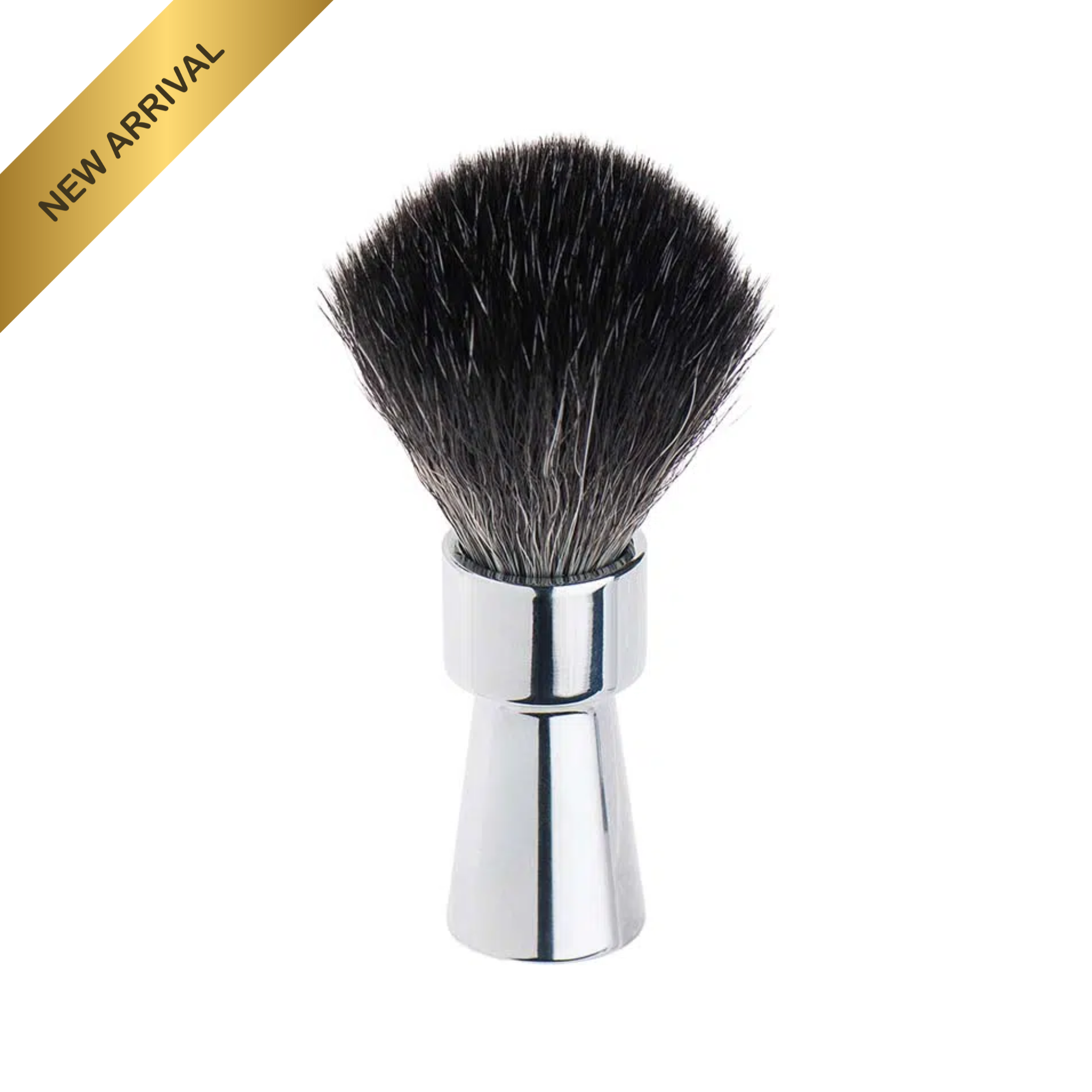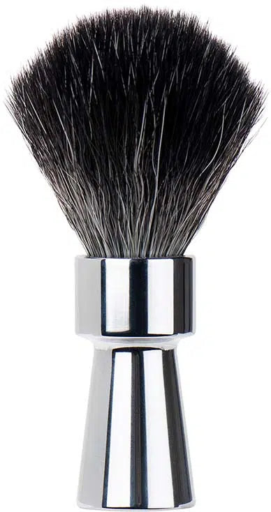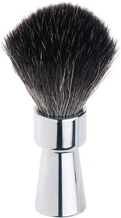 The MERKUR Shaving Brush 1100 features luxurious black and grey vegan synthetic hair, creating a smooth lather and gentle facial massage for a refreshing shave. Made from anodized aluminum with a bright chrome surface, this brush combines durability with elegance.